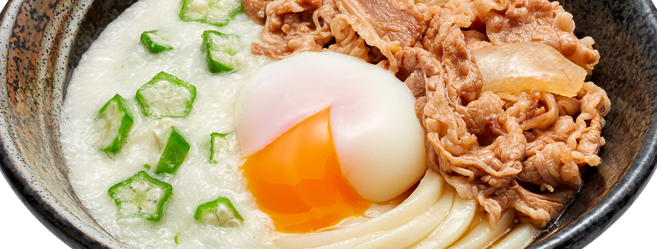人気の玉とろぶっかけに、甘辛く煮た自慢の牛肉を贅沢に合わせました。