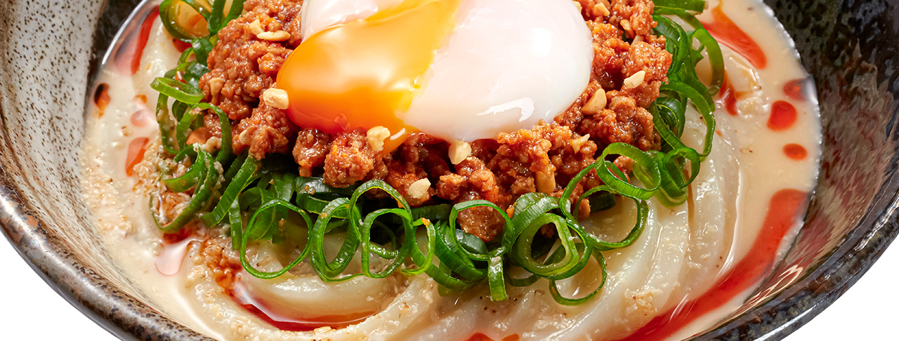 ピリ辛の本格的な担々うどんに、とろ~りとした温玉をトッピングしました。温玉を崩して麺や肉味噌によく絡めれば、一気にクリーミーでマイルドな味わいへと変化します。