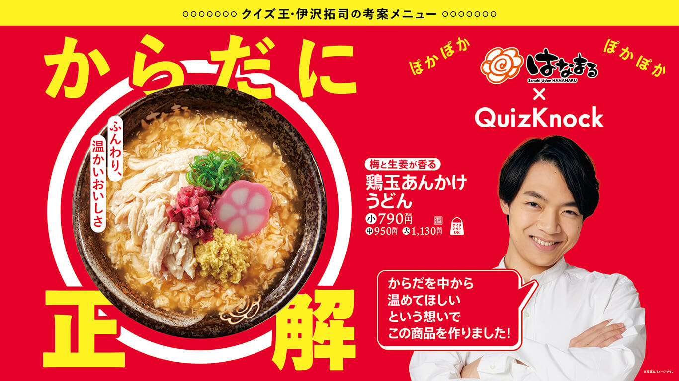 株式会社baton(本社:東京都品川区 代表取締役:衣川洋佑)が運営する知的エンタメ集団「QuizKnock(クイズノック)」とコラボレーションし、伊沢拓司氏が監修した新商品「(梅と生姜が香る) 鶏玉あんかけうどん」を、2025年12月9日(火) から12月29日(月)までの3週間限定で、全国のはなまるうどん(*一部店舗除く)にて販売いたします。